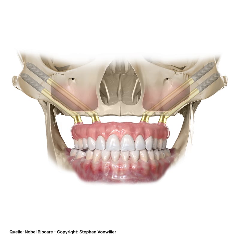 Zygoma-Implantate sind eine spezialisierte Lösung innerhalb des Konzepts ‚Feste Zähne an einem Tag‚ – entwickelt für Patient:innen mit extremem Knochenverlust im Oberkiefer, bei denen klassische Implantatlösungen nicht mehr ausreichen.